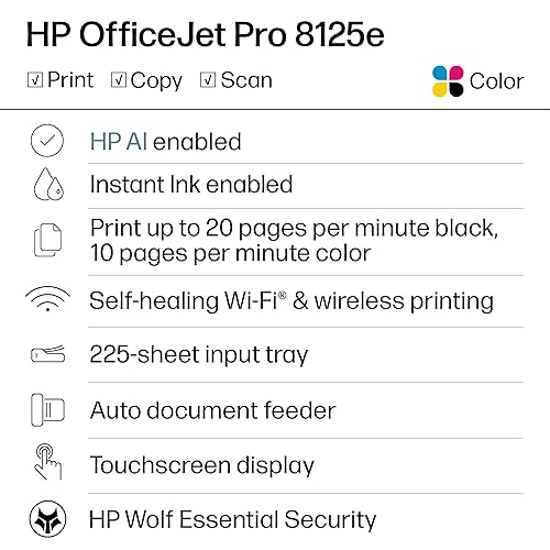 HP OfficeJet Pro 8125e Wireless All-in-One Color Inkjet Printer, Print, scan, Copy, ADF, Duplex Printing Best-for-Home Office, 3 Month Instant Ink Trial Included, AI-Enabled (405T6A)