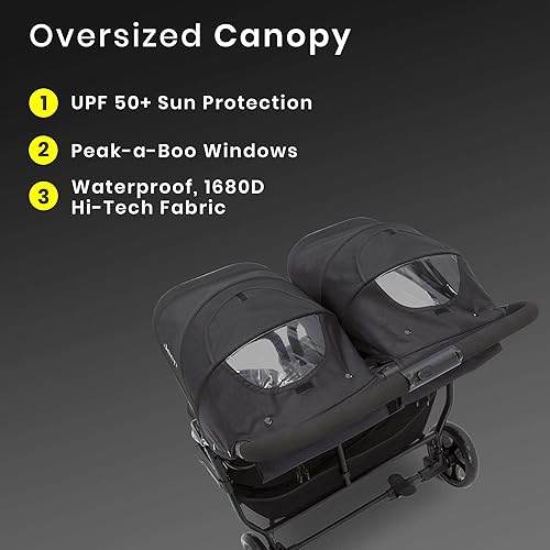 – Oversized canopies with SPF 50 sun visors and peek-a-boo windows