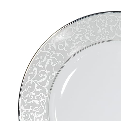 – Parchment dinnerware collection with gray border and scroll design