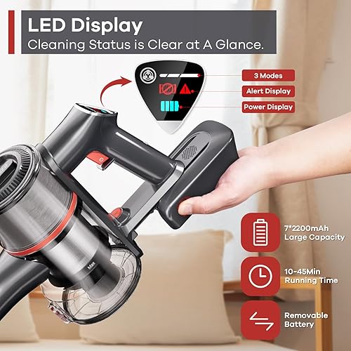 – Powerful suction quickly and efficiently picks up debris on various surfaces
